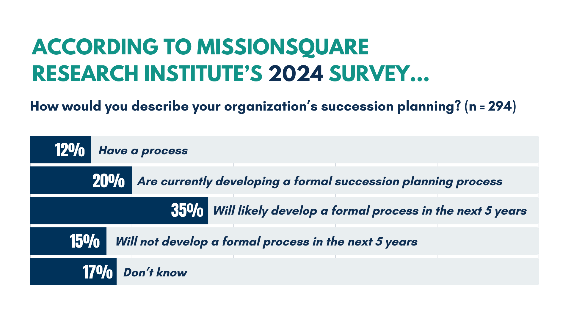 Succession planning in the public sector is, at best, inconsistent. While many agencies recognize its importance, few have implemented formal processes to address leadership continuity. According to a recent survey by the MissionSquare Research Institute, only 12% of public sector HR managers report having a well-defined succession planning process in place—a modest 1% increase since 2016. Meanwhile, 35% of agencies intend to develop such a process within the next five years, but progress remains slow.